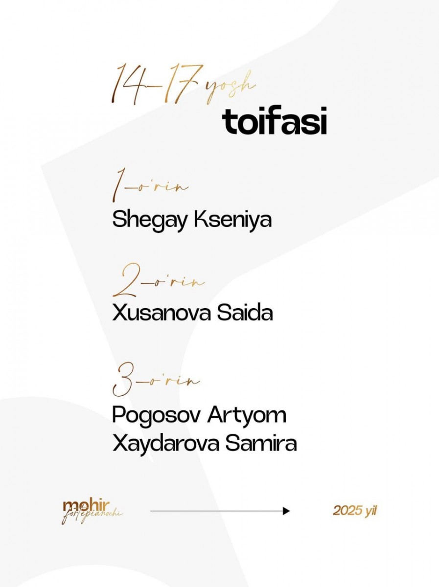 Mazkur tanlovda Chirchiq shahar Maktabgacha va maktab ta’limi bo‘limi tasarrufidagi 9-sonli umumta’lim maktabining iqtidorli va faol o‘quvchisi Shegay Kseniya 14–17 yosh toifasida 1-o‘rinni qo‘lga kiritdi.